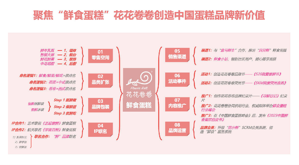 此外,立足于品牌定位,洛可可还在零售空间、销售渠道、品类拓宽、活动事件、品牌运营等方面,给出完整方案与建议,如门店厨房采用中岛名厨吸引顾客,销售渠道增加鲜食小站辐射社区用户,推出“魔盒蛋糕”品类,突破增量市场,以突出花花卷卷鲜食蛋糕定位,拓展增量市场,吸引更多消费者。